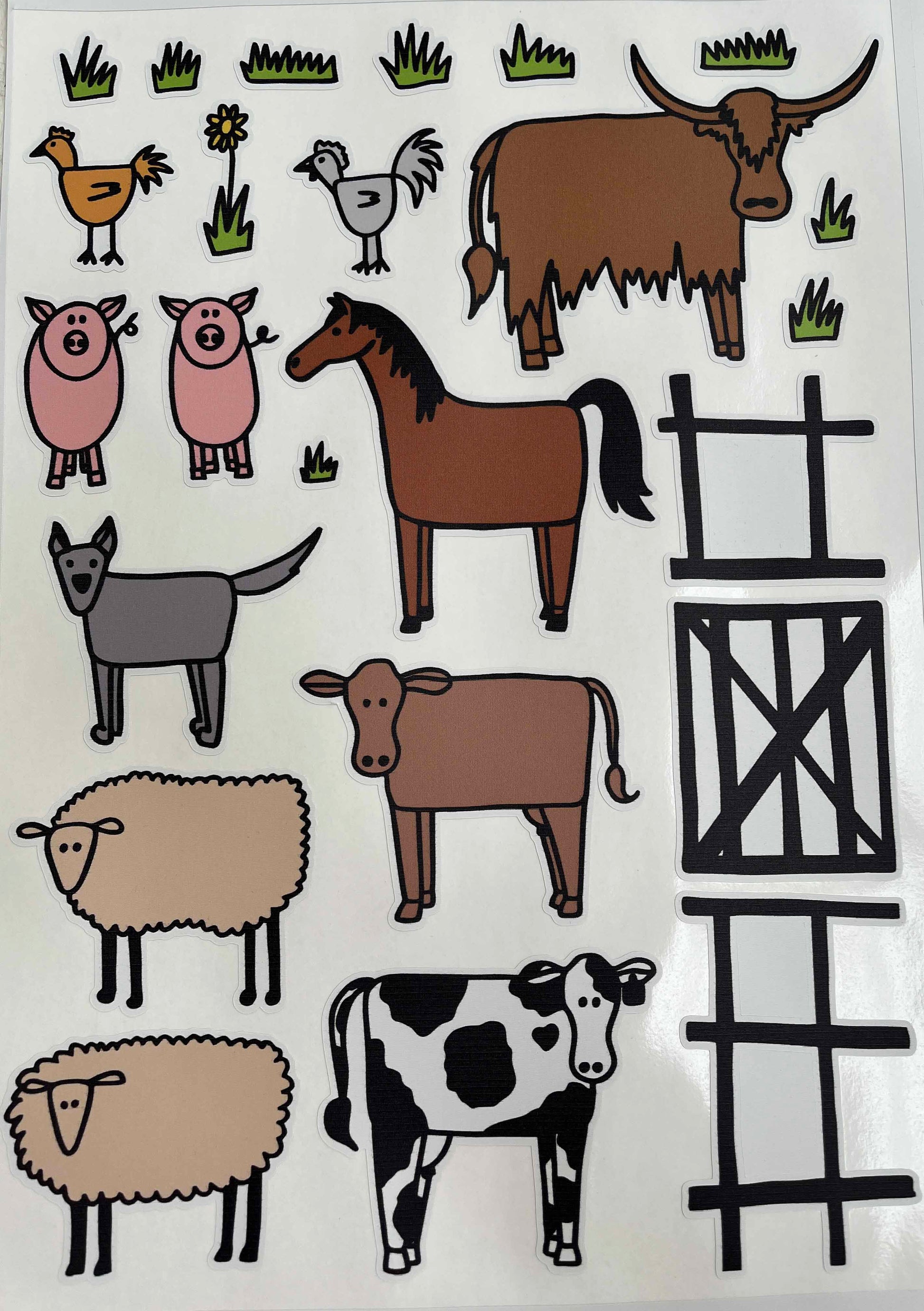 Each sheet has - Two Pigs, one Horse, one Dog, Two sheep, Two Cows, Two Chooks, and one of the Highland cattle.